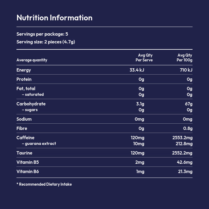 Partially derived from guarana, each piece contains 60mg of caffeine for clean & efficient energy boost.
